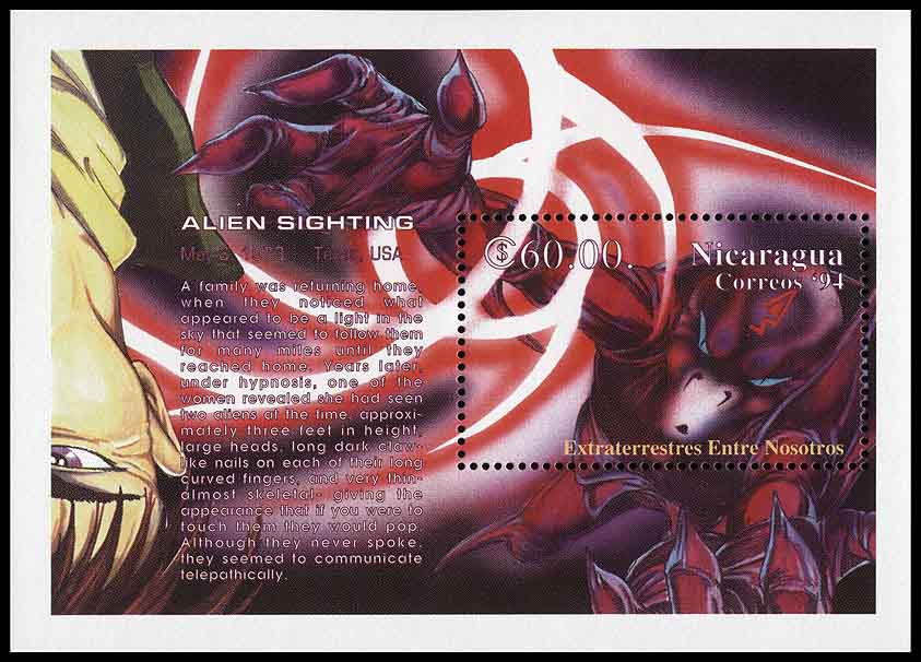В наборе «(There Are) Aliens Among Us» последнему блоку никарагуанской серии соответствует карточка № 4. Наверное, вы уже заметили, что изображения блоков даются не по мере возрастания номеров соответствующих им голографических карточек. Дело в том, что в первую очередь рассматриваются почтовые выпуски, а в каталоге «Michel», по которому даётся нумерация всех марок, порядок следования блоков именно такой, как в статье. В других филателистических каталогах блоки Никарагуа могут быть описаны в другой последовательности. Например, так, как это сделано в каталоге «Scott».