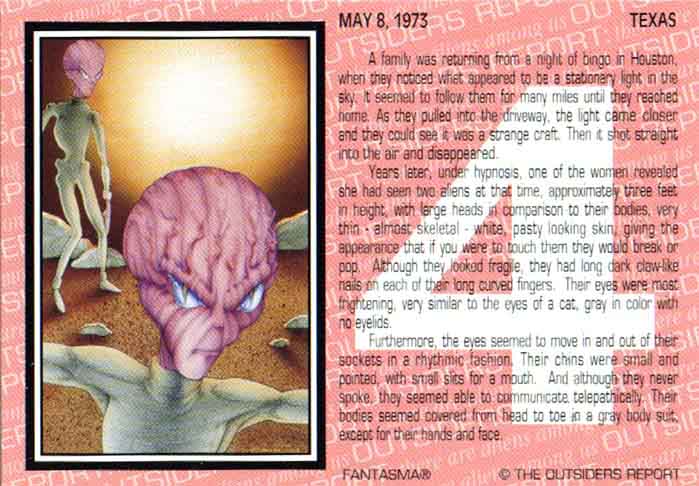 В литературе о инопланетянах нет описания встречи, датированной 8 мая 1973 года. Но есть рассказ о майском происшествии в Техасе без указания конкретной даты. Эта история похожа на историю, рассказанную на карточке, но более подробная и жестокая:
