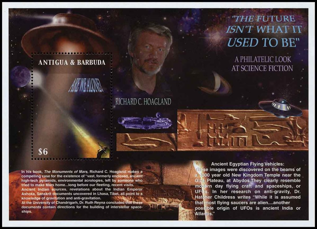 «Летающие тарелки» — частые гости научной фантастики, и в филателии это тоже отражено. Например, на одном из блоков карибского государства Антигуа и Барбуда 2002 года (Michel block № 559), выпущенном в серии «Филателистический взгляд на научную фантастику», изображено несколько «летающих тарелок», а на марке написано: «Одиноки ли мы?» Кроме того, на рисунке блока также приводятся «свидетельства» инопланетных посещений. Так, в правой части блока показан отретушированный фрагмент резьбы на камне из древнего египетского города Абидос. По уверению создателей блока, на рисунке изображены древние египетские летательные аппараты: