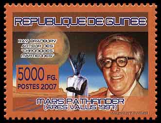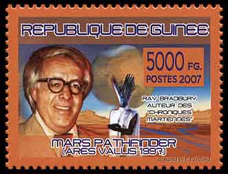 Фантасты давно заселили Красную планету древними цивилизациями. Например, в «Войне миров» Герберта Уэллса высокотехнологичные агрессоры прибыли на Землю именно с Марса. А в цикле рассказов Рэя Брэдбери «Марсианские хроники» прибывшие на Марс земляне обнаружили загадочную цивилизацию. На почтовых миниатюрах Гвинеи 2007 года (Michel № 5291, 5292) изображены писатель, Марс и марсианин. Французский дизайнер Поль Пувиллан позаимствовал жителя Марса из второй серии телевизионного мини-сериала «Марсианские хроники», снятого по произведениям Брэдбери и впервые показанного американской телекомпанией NBC в январе 1980 года. Марсианин выглядит очень необычным из-за причудливой маски.