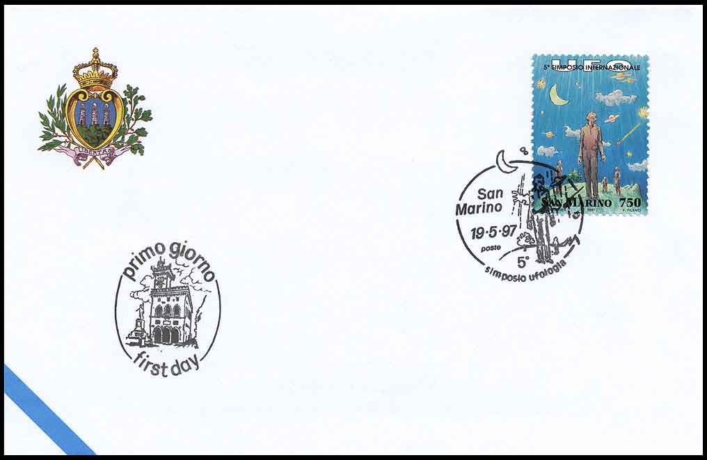 Наверное, такие, как Хогланд, увлекающиеся люди с весьма специфическими взглядами устраивают конференции по проблемам НЛО. Вверху — конверт первого дня Сан-Марино, посвящённый пятому международному уфологическому симпозиуму. На марке 1997 года (Michel № 1715) изображены люди, стоящие на земном шаре и глядящие вверх на «летающие тарелки». На спецштемпеле первого дня также изображены глядящие вверх люди и «тарелочка».