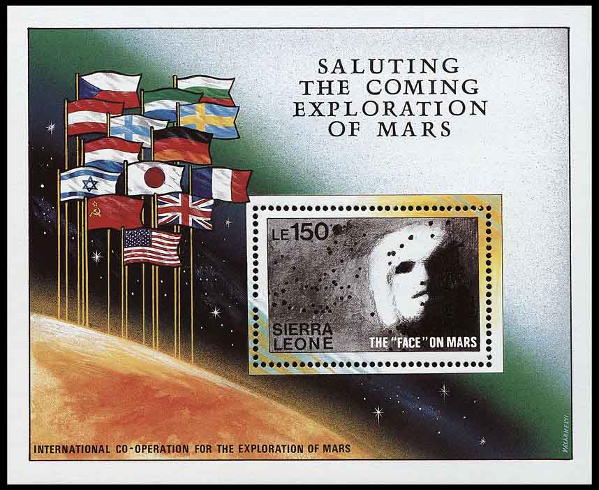 Вверху показан блок со скандальным рисунком. На поле надписи «Приветствие ближайшего исследования Марса», «Международное сотрудничество в исследовании Марса» и флаги четырнадцати государств. На марке надпись «„Лицо“ на Марсе» и рисунок этого артефакта, выполненный с отретушированного негатива NASA.