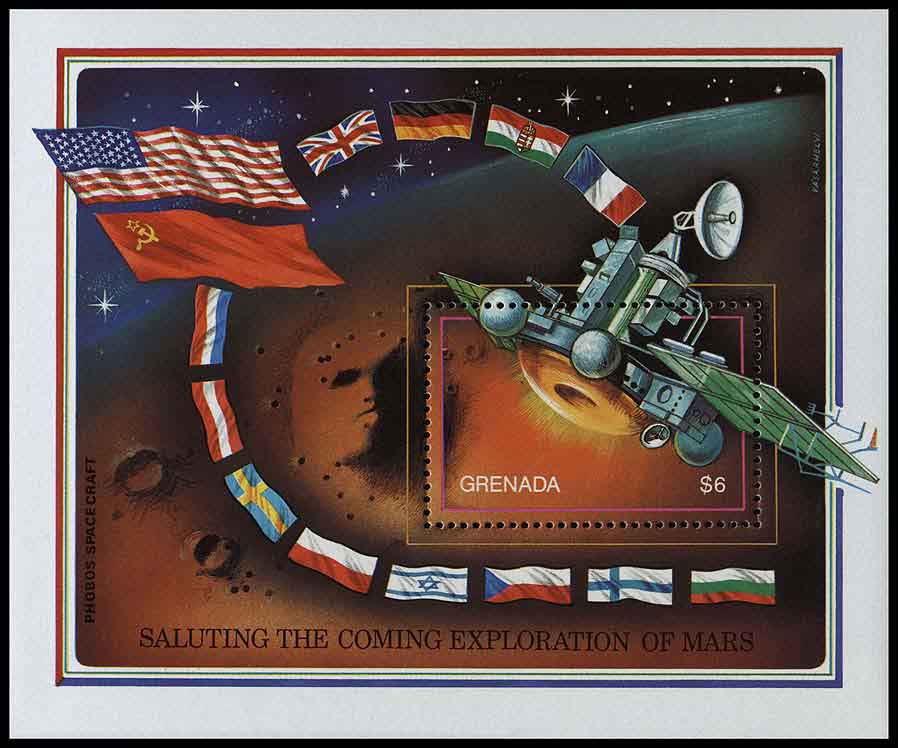 По своему сюжету блок Гренады схож с блоком Сьерра-Леоне: «лицо на Марсе», флаги 14 государств, надпись «Приветствуя ближайшее исследование Марса». Но есть и различия: на гренадском блоке изображена советская автоматическая станция «Фобос».