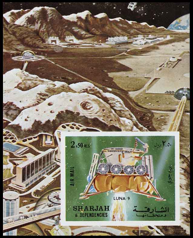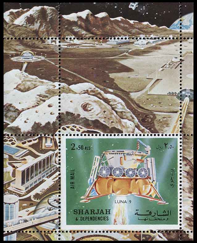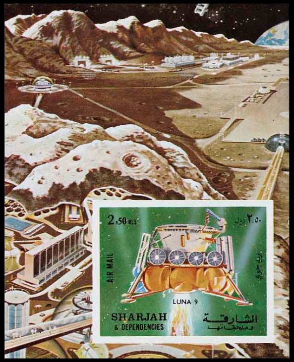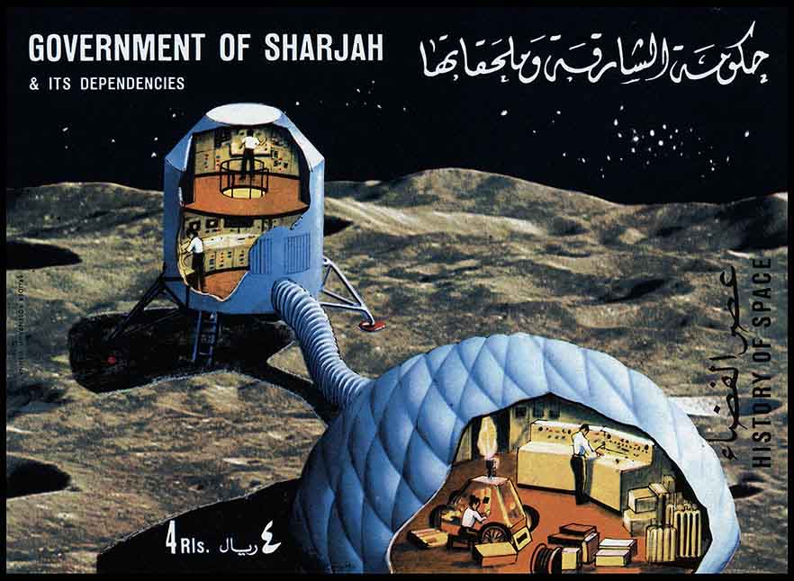Часть изображения на блоке Шарджи закрыта маркой, но всё равно видно, что рисунок огромного поселения детально проработан. Этот лунный город нарисовал американский иллюстратор Рой Скарфо для статьи «После „Аполлона“, колонии на Луне», которую написал писатель-фантаст Айзек Азимов. Впервые рисунок вместе со статьёй Азимова опубликован в New York Times Magazine (1967. — 28 May. — P. 31). Позднее Азимов включил статью в книгу «Today and Tomorrow and…» (1973).