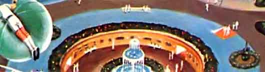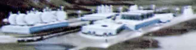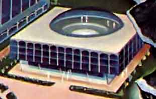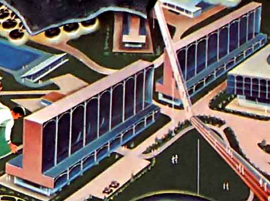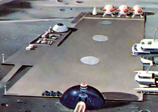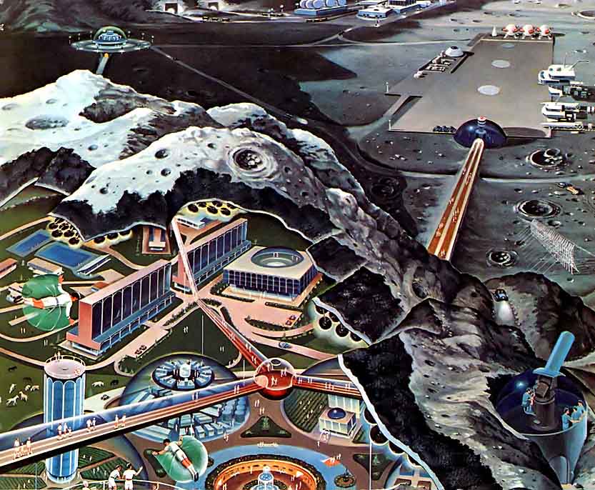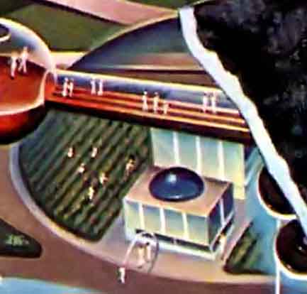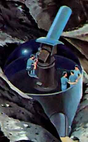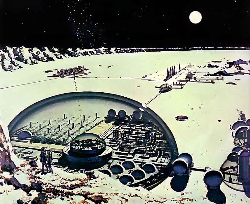 Ещё одна иллюстрация Роя Скарфо к статье о лунных колониях будущего. На рисунке показана постоянная база, такие сооружения заменят своих надувных временных предшественников. Автор статьи предполагал, что в 1975 году, через шесть лет после первой высадки людей на Луну будет построена первая научная станция, а ещё через три года, в 1978 — лунная колония.