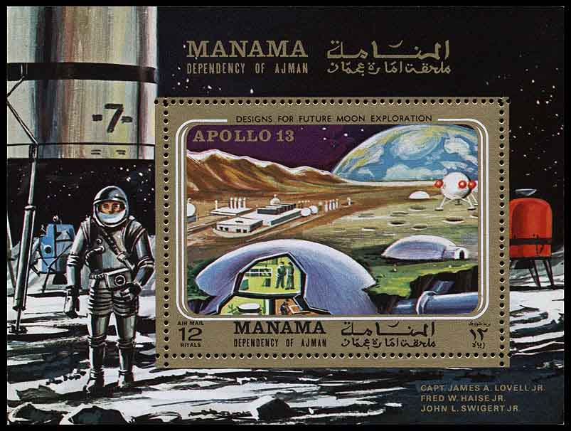 Этот же промышленный комплекс можно обнаружить на блоке Манамы 1970 года (Michel block № 63), рисунок которого выполнен по мотивам фрагментов иллюстраций американских художников, в том числе и Роя Скарфо. Так же, как и на рисунке лунного города, на марке блока справа от промышленного комплекса изображён большой космический корабль (24) на фоне возвышающейся над горизонтом Земли. Судя по форме корабля, он не предназначен для полёта в земной атмосфере. Такой корабль способен доставлять людей и грузы в другие районы Луны и на орбитальную станцию (4).