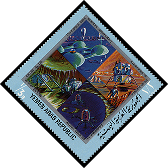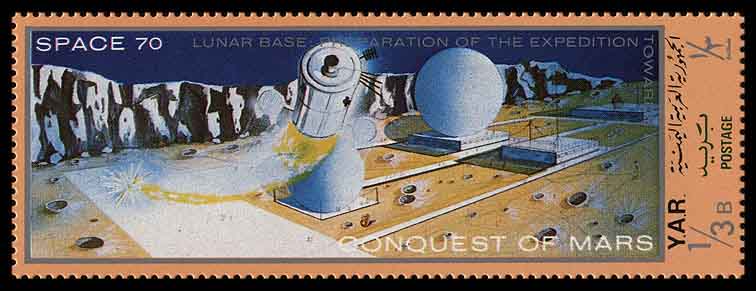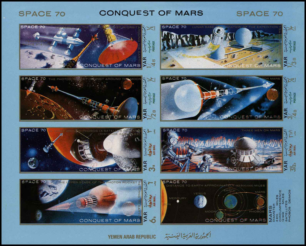 Работая над рисунками марок «Завоевание Марса», йеменский художник очень творчески переосмыслил иллюстрации других художников.