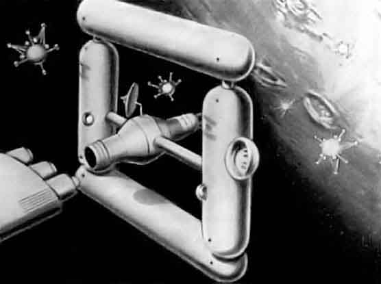 В докладе «Лунный космический транспорт в 2001 году» также упоминается об орбитальной космической станции с шарами-модулями. Станция находится в постоянной перестройке, к ней добавляются новые модули лабораторий и жилых помещений. Станция вращается, что создаёт искусственную силу тяжести в модулях. Космический корабль, доставляющий на станцию людей и оборудование, стыкуется перпендикулярно плоскости станции, у её оси вращения. Затем рельсовая система переводит корабль на внешнее кольцо станции.