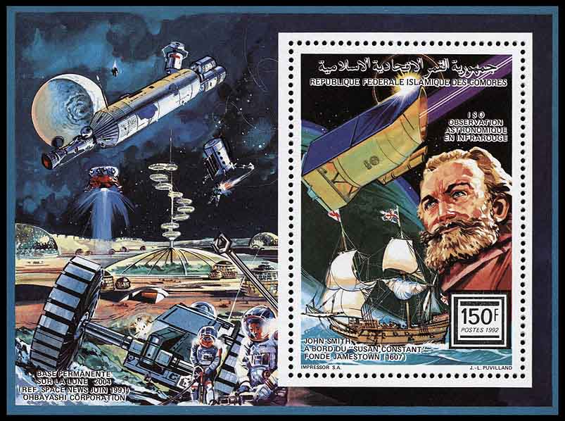 На марках появлялись не только лунные станции и базы, но и города. Например, на люкс-блоке Коморских Островов 1992 года (Michel block № 375) изображён купол и башня большого поселения землян.