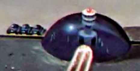 Куполообразное строение с сигнальными огнями на башне — вокзал. Сквозь полупрозрачную поверхность купола различимы фигуры людей. Слева от вокзала стоят лунные такси.