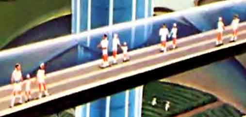 В городе движущиеся пешеходные тротуары расположены в прозрачных трубах (19), проложенных ближе к своду лунного города.