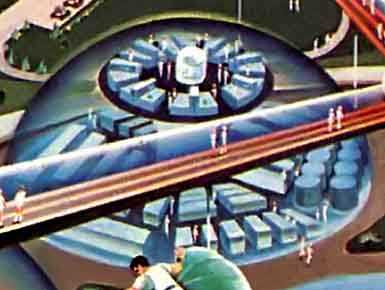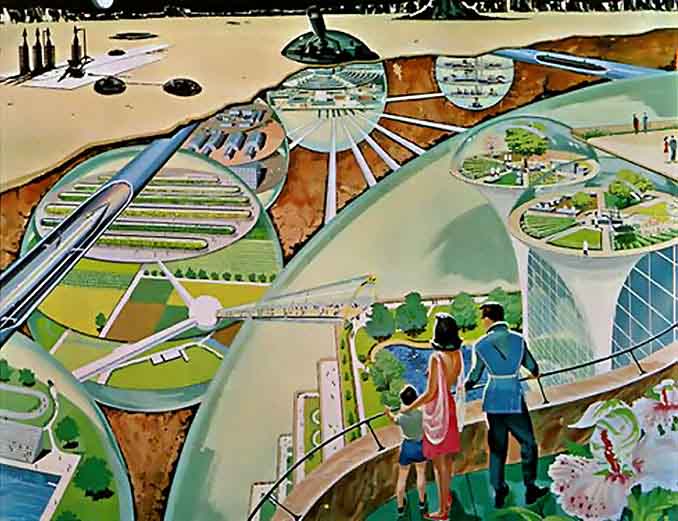 Лунные города встречаются и на других рисунках Скарфо. Например, на иллюстрации, выполненной для концепции «Дженерал электрик», изображён огромный лунный город под прозрачным куполом. Высота купола 400 метров, диаметр 2 километра.