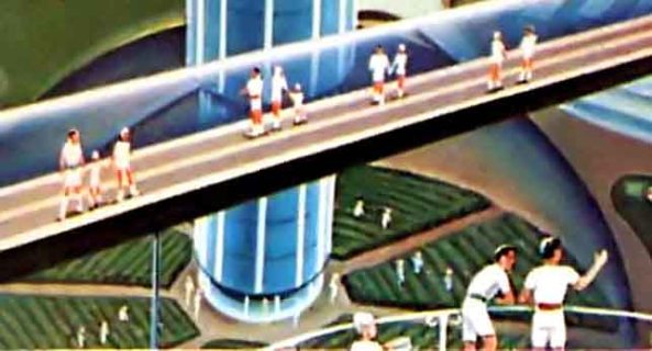 От космопорта до города проложены движущиеся пешеходные тротуары (6). Они разделены на три ленты, скорость каждой отличается от соседней на 5 миль в час (скорости лент 5, 10 и 15 миль в час). Местные жители (луняне) и гости Луны в зависимости от того, как быстро они хотят добраться до нужного им места, переходят с одной ленты на другую.