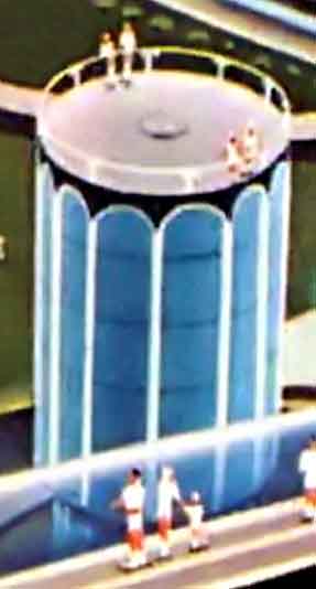 Лунный олимпийский стадион можно увидеть и на другом рисунке Скарфо. Здесь также изображён подземный город на Луне, разделённый на жилую, производственную, научную, сельскохозяйственную и спортивную зоны. На поверхности расположены космопорт и обсерватория. Олимпийский стадион находится в нижнем левом углу рисунка.