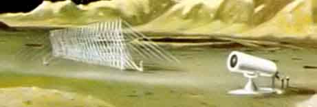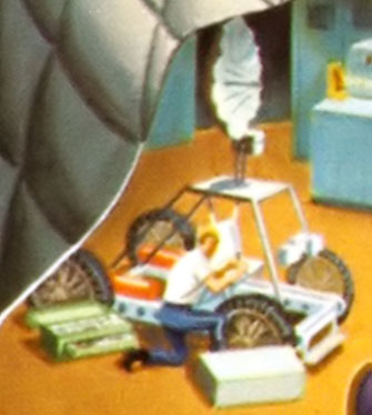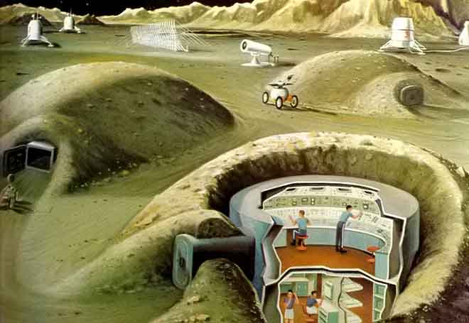 Слева изображено четырёхколёсное средство передвижения, выезжающее из базы. В центре рисунка ещё один «луноход» с круглым корпусом. За ним находится большой оптический телескоп и астронавты около него. Слева от телескопа расположен радар. На заднем плане, слева и справа — лунные посадочные модули.