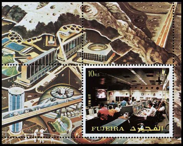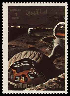Надувная лунная база с рисунка Роя Скарфо перекочевала на марки, её можно увидеть на блоке Шарджи 1970 года (Michel block № 69) и на почтовой миниатюре Умм-аль-Кувейна 1972 года (Michel 1200).