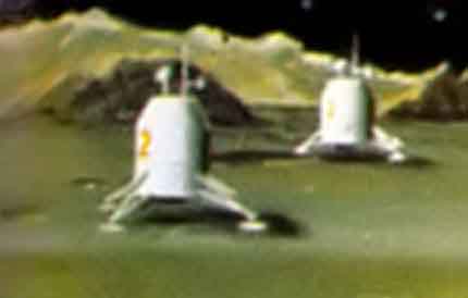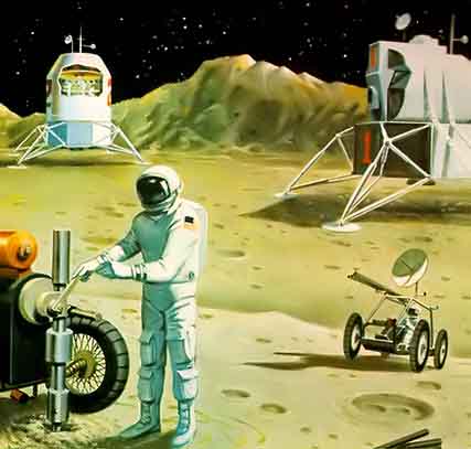 По замыслу автора, вслед за посадочными модулями «Аполлон» (один из них изображён в верхней правой части рисунка) на Луну отправятся посадочные модули-базы. Слева вверху — лунный посадочный модуль-жилище будущего с экипажем из нескольких астронавтов. Джонсон писал, что использование подобных посадочных модулей позволило бы в 1971—1972 годах совершать 14-дневные экспедиции на Луну. С другого посадочного модуля спущен одноместный «луноход» (в правой части рисунка). На таких транспортных средствах астронавты смогут удаляться до 8 километров от места посадки.