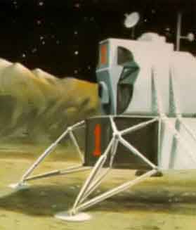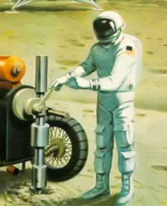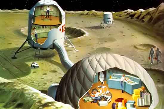 На рисунке показан купол надувной лунной базы, в ней два астронавта, контейнеры, баллоны и одноместное средство передвижения по лунной поверхности. Гофрированный лаз соединяет базу с посадочным модулем. Учёные и техники могут жить в таких базах в течение долгого времени.
