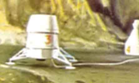 Левый рисунок, с синим фоном, интересен тем, что на оригинальной иллюстрации Скарфо нет астронавта, опустившегося на колени. Надпись: «Исследование лунных слоёв».