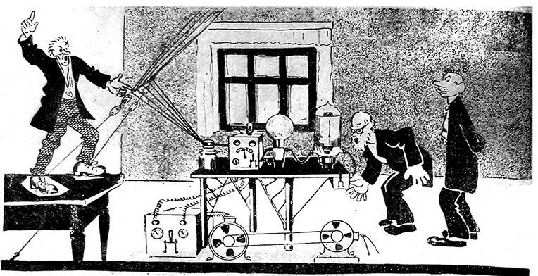 Филамент Авдионович грациозно спрыгнул со стола и торжественными шагами направился к аппарату, где вместе с приятелями весьма энергично завозился. Скоро аппарат ожил, загудел, запел на все лады, застучал, заревел, задвигался. Монотонно гудел трансформатор. Умильно и тихо, как лампады, горели лампы. Мотор завывал свою железную песенку, и каждые 20 секунд злобно каркала искра. Приятели смотрели зачарованные. Тогда Филамент Авдионович вытащил часы, обвел всех глазами и, крикнув: «Готово!», включил рубильник. Страшный грохот пронесся по комнате, осветившейся зеленым светом. Запахло озоном. Филамент Авдионович, весьма похожий в данный момент на Мефистофеля, ожесточенно крутил какую-то рукоятку, с колоссальной частотой переводя глаза с амперметра на часы, и лихорадочно повторял: «Сейчас… сейчас!..» Катодников впился глазами в волномер. Батарейкин дрожал от ожидания и шептал: «Скоро ли?»