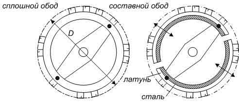 Каждая часть обода была спаяна из двух полосок — латунной и стальной. Пластины в зависимости от температуры изгибались (изгиб происходит в сторону металла с меньшим коэффициентом теплового расширения), меняли диаметр D баланса и, соответственно, замедляли или ускоряли ход модернизированного хронометра ровно настолько, насколько «ошибался» хронометр с обычным балансом.