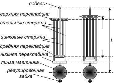 Секрет в стержнях. Они подобраны таким образом, что суммарное изменение длины стальных стержней компенсируется изменением длины цинковых, поэтому длина маятника L остаётся неизменной, соответственно и период его колебаний остаётся постоянным.