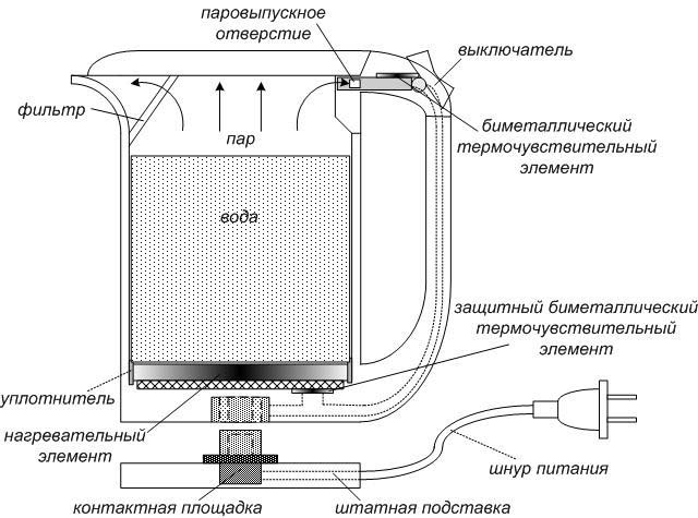 Как работает электрочайник? Да очень просто! Внутри ёмкости для воды находится электрический нагреватель, который после нажатия на кнопку включения нагревает воду и доводит её до кипения. Образующийся при этом пар разогревает биметаллическую пластину, которая выгибается и возвращает включатель в исходное положение, то есть отсоединяет нагреватель от электросети. Ещё один биметаллик (защитный) соприкасается с нагревателем и срабатывает только при его перегреве.