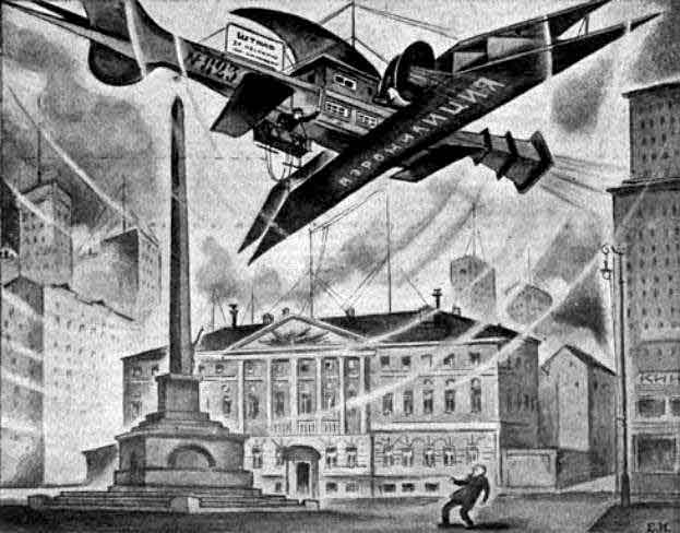 Из нависшей над площадью огромной тучи вынырнула несметная стая летающих небоскребов, дирижаблей, гидролетов, астропоездов, авиациклов, броньавионов, грузопланов и в стройном порядке двинулась на восток в сизую дымчатую даль.