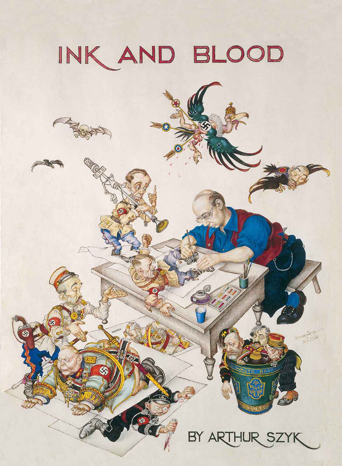 «Кровь и чернила» (1944). Фронтиспис-автопортрет к планирующемуся сборнику карикатур Шика с таким названием был нарисован еще до завершения войны, а сам сборник вышел уже в 1946 — изрядно пополнившись…