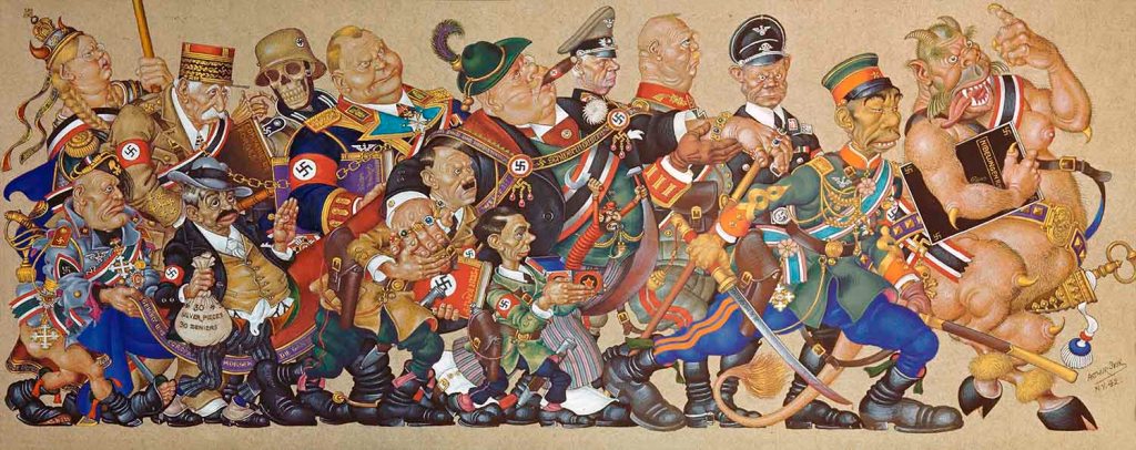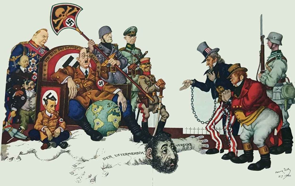 «Новый порядок» (1941). Америка еще не вступила в войну; насчет итальянских и японских союзников германского нацизма пока что сохраняются некие иллюзии (они, судя по определенной растерянности, даже выглядят слегка «невольными» союзниками), но насчет центральной фигуры — ни малейших.