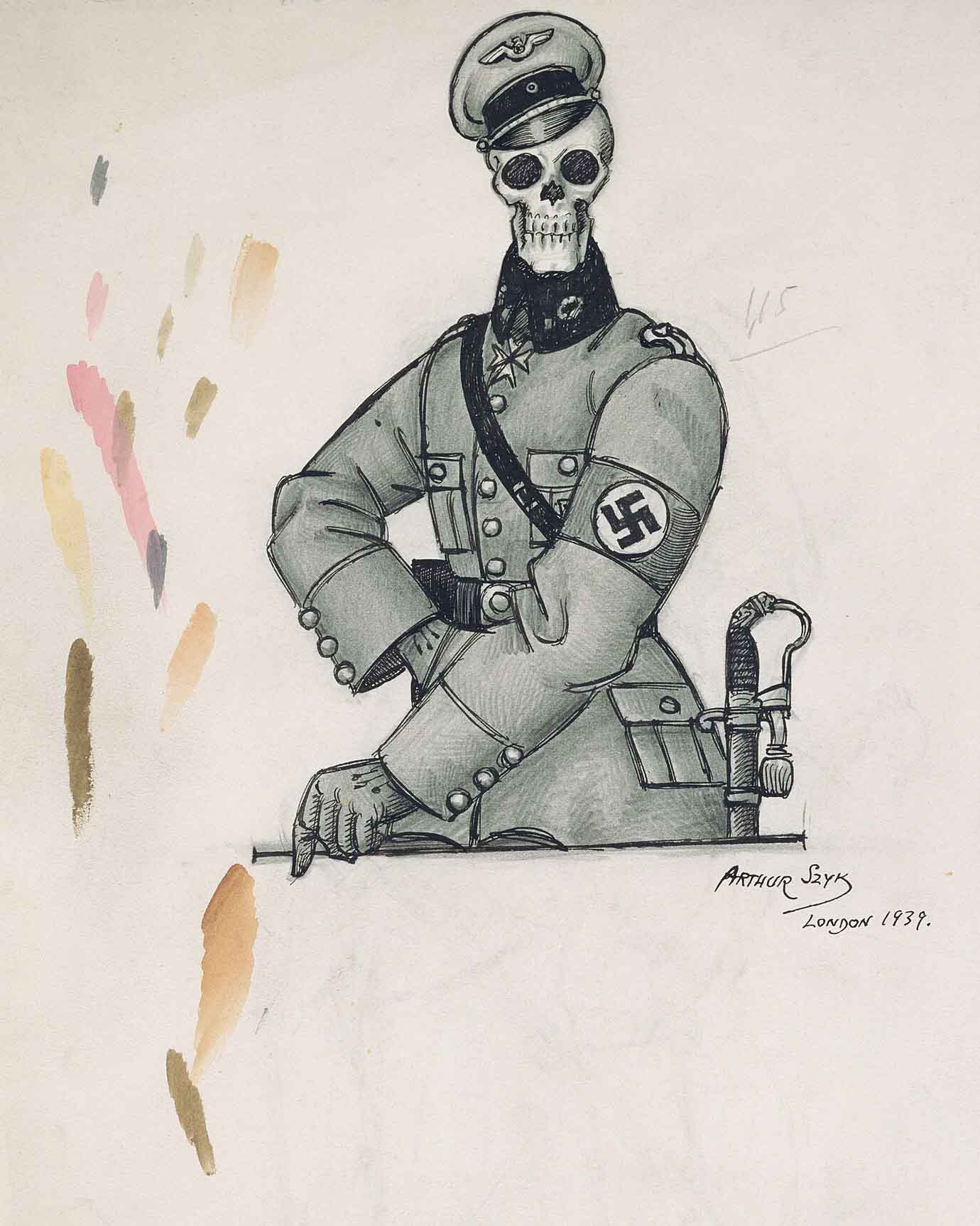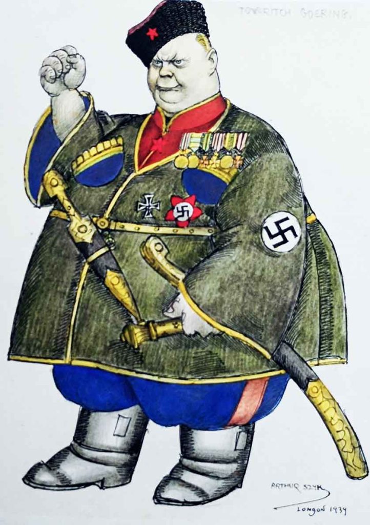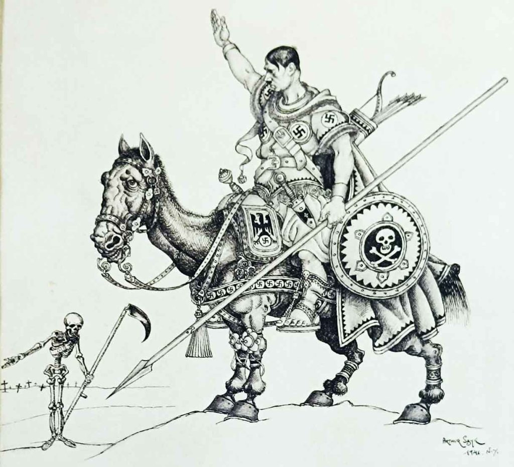 «Нам перестало хватать евреев!» (1943). Имеется в виду, что число убитых евреев оказывается недостаточным для всеобщего процветания Европы: ведь нацисты гарантировали — чем больше евреев уничтожить, тем ярче Европа расцветет! А тут — на столе лежит извещение: «Гестапо сообщает о 2 000 000 казненных евреев»… но процветания что-то не видать! Гитлер, Геринг, Геббельс и Гиммлер (странно похожий на Тодзио) в растерянности: где взять еще евреев?