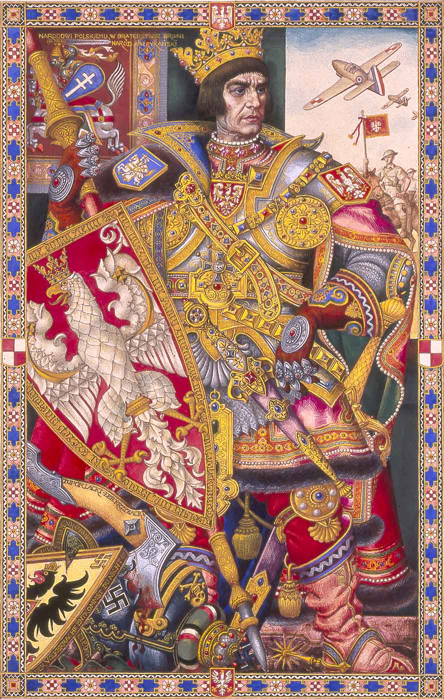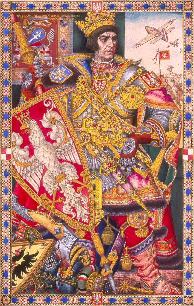 Серия «Братство по оружию» (1942): почетные портреты легендарных полководцев народов, ведущих борьбу против фашизма. Польский король Ягайло — пусть он и «главный победитель» в Грюнвальдской битве (на секире, всаженной в украшенный свастикой шлем, надпись: «Топор ляшский — лоб крыжацкий»), но применительно к текущим событиям немного не по теме…