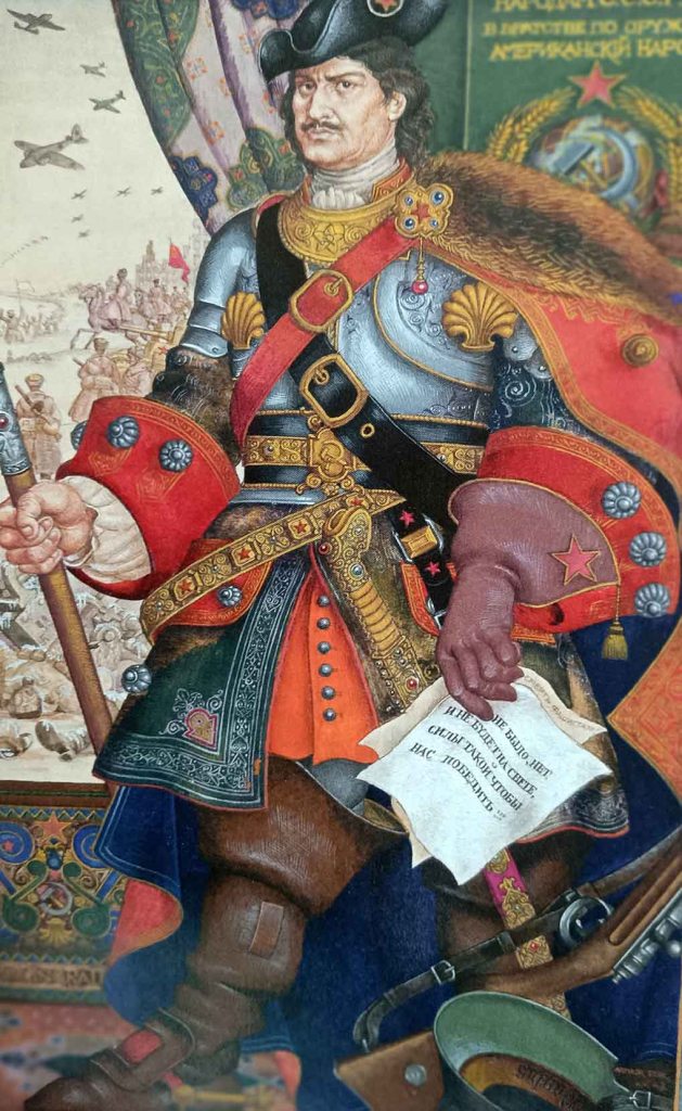 Не узнаёте, кто это? Петр I, с советским гербом совместимый уж никак не хуже, чем Жанна д’Арк с якобинским головным убором. Узнать, впрочем, действительно мудрено: лицо-то вполне петровское, а вот телосложение — отнюдь. Впрочем, на то и условность батально-исторического плаката. Вторжение современности ощутимо куда больше, чем в случае с Польшей и Францией, и вот оно-то вполне по теме — что неудивительно: у Петра и его наследников уже «в активе» ни много ни мало разгром немцев под Москвой…