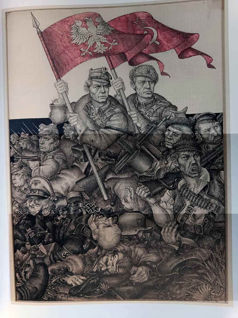 У обоих солдат, польского и русского, очень характерные лица — совершенно непохожие, но одинаково грубовато-мужественные. Художник еще не раз использует их в изображении русских и польских воинов самых разных эпох, символически или реально противостоящих фашизму, зародыши которого, в понимании Шика, тоже распространились по многим векам и странам.