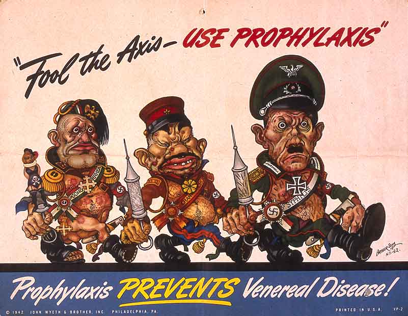 «Обмани Ось — используй профилактику!» (1942). Это уже ирония «ниже пояса», но, похоже, до американских солдат в ту пору трудно было достучаться иначе. Имеется в виду, что любой военнослужащий, который выбыл из строя потому, что подцепил венерическое заболевание, тем самым попался на уловку стран Оси (Италия, Германия, Япония). Хотя их лидеры (Японию по-прежнему представляет премьер Тодзио), как видно, и сами не убереглись, а уж Муссолини — паче всех…