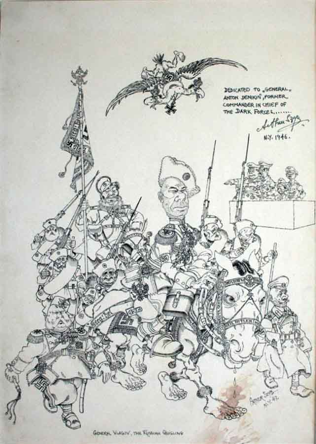 «Генерал Власов — русский Квислинг» (1943). Ну, нам для того, чтобы понять, кто такой Власов, не надо использовать сравнение с Квислингом. Любопытно другое: эта карикатура посвящена… генералу Деникину — как человеку, который, пребывая в оккупированной Франции под властью германской комендатуры и гестапо, категорически отказался от любых форм коллаборационизма!