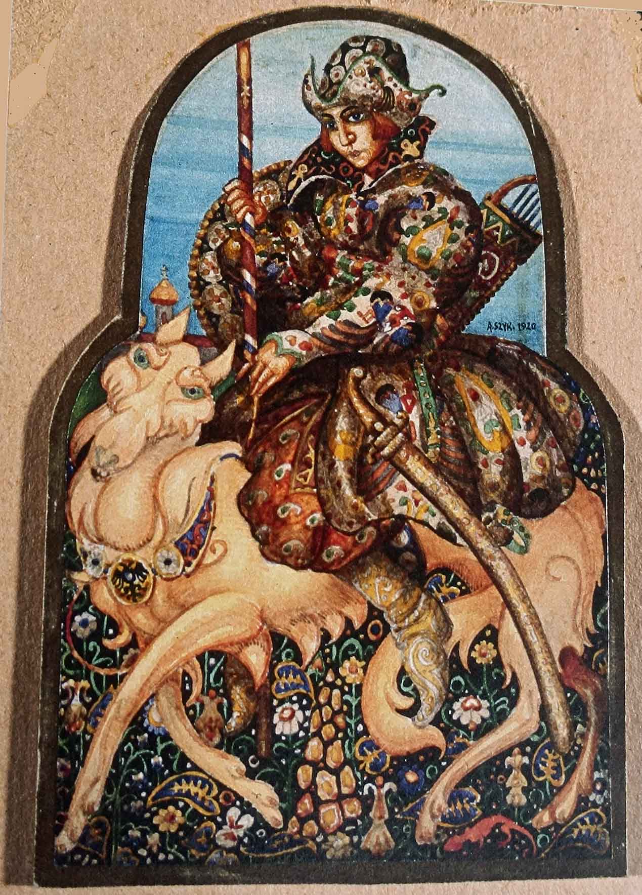 Иллюстрация для французского сборника русских сказок, изданного в 1920 году. Думаете, это Иван-царевич на сером волке? Не совсем: «Ivan Tsarevitch et le Loup Garou». А по-французски «луп гаро» — то же, что по-немецки «вервольф»: оборотень. Впрочем, этот конкретный волк пока что замер на полупревращении скорее в коня, чем в человека!