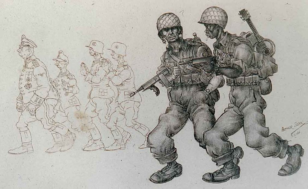 Рисунок 1944 года. Диалог американских солдат, конвоирующих пленных гитлеровцев. Белый: «А что бы ты хотел сделать с Гитлером?» Черный: «Я бы сделал его негром — и отправил в США!» И белому солдату нечего возразить, хотя в данный момент они братья по оружию. Воистину Шик не льстил и Америке!