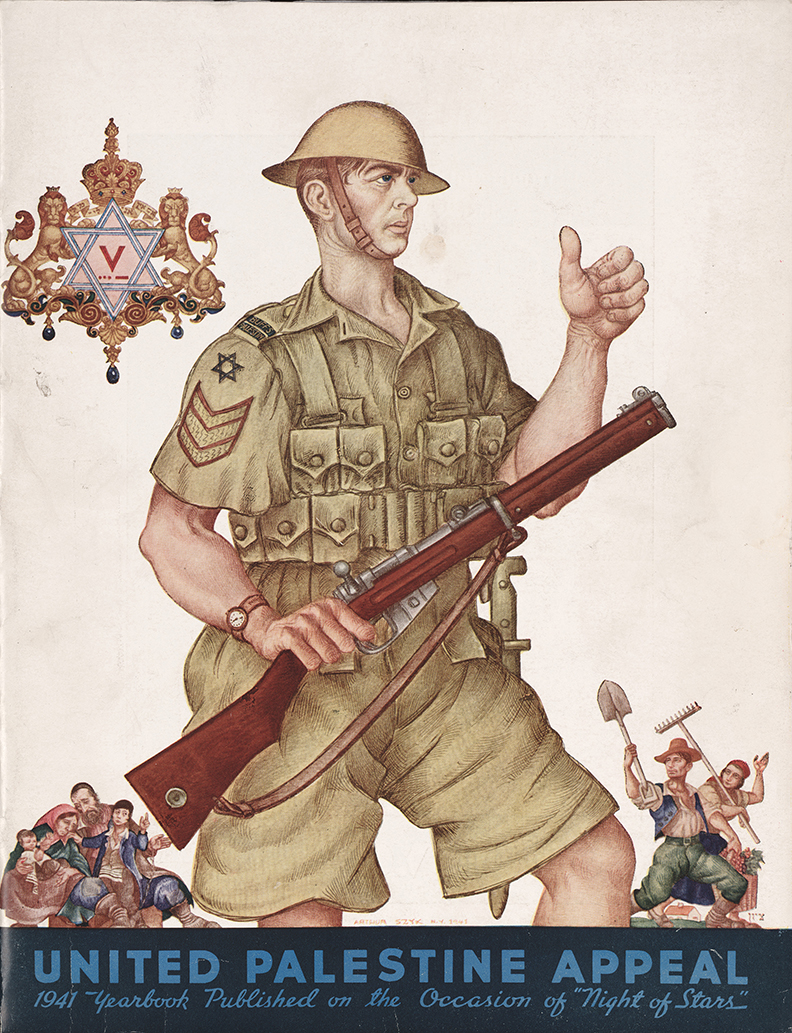 «Объединенный палестинский призыв» (1941): еврейский солдат в британской армии сражается и во имя своих соплеменников, находящихся в когтях нацистов (слева), и как защитник киббуцников в Эрец Исраэль (справа) от арабских террористов, еще не знающих, что через какое-то время именно их будет принято называть «палестинцами».
