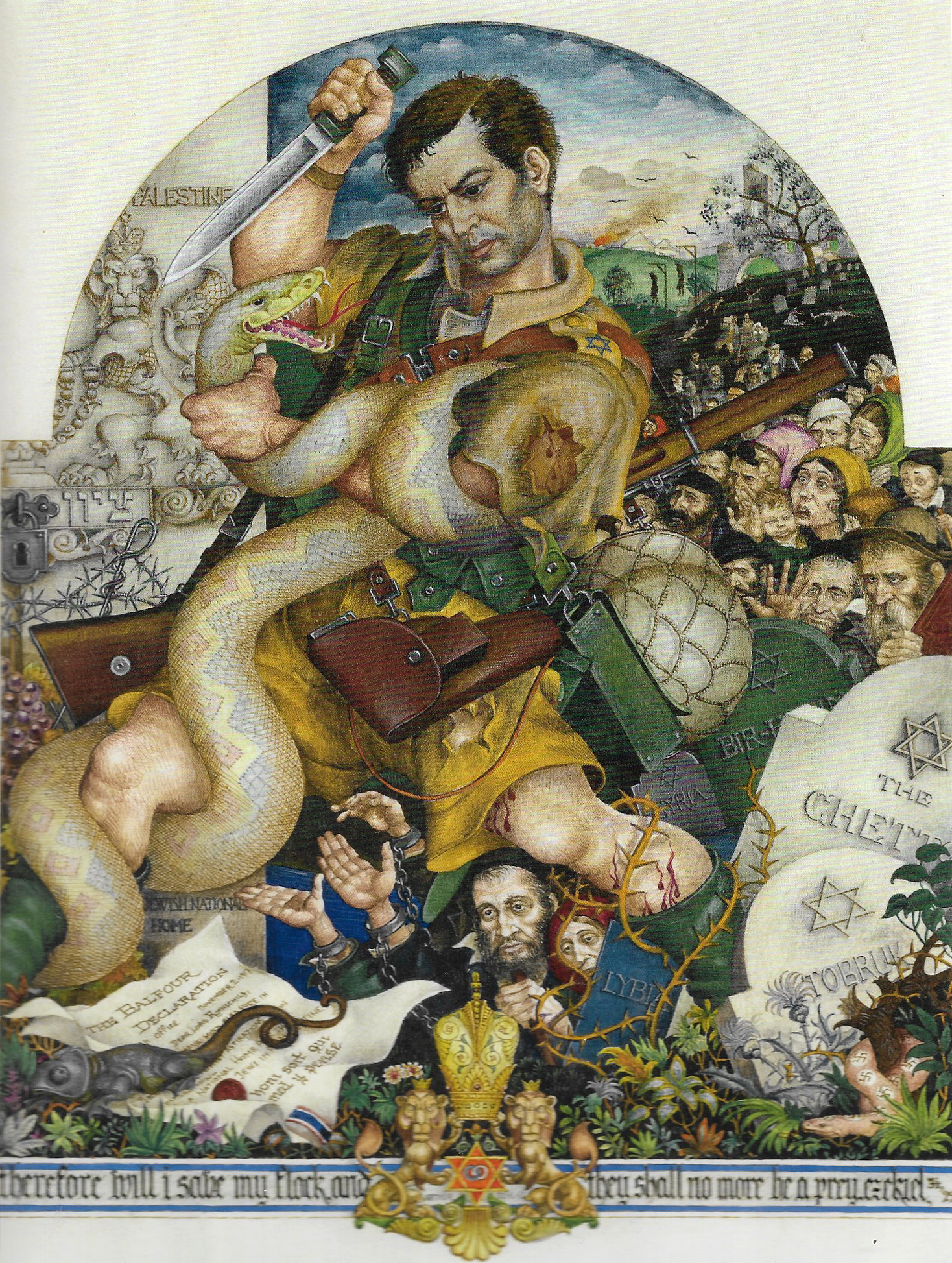 «Белая книга» (1943). А вот и снова тот «дракон» — пускай в змеином миниварианте мусульманского терроризма. Что это за «Белая книга» — см. вот тут: https://ru.wikipedia.org/wiki/Белая_книга_1939_года, хотя этот вариант википедийной статьи выглядит, мягко говоря, ну о-о-очень сжатым по сравнению с, например, англоязычным. Что до сути — то Шик показывает сопротивление еврейских поселенцев (настроенных в целом пробритански и уж совершенно точно антигитлеровски) «зме́ю» терроризма арабских, гм, активистов тогдашней Палестины, настроенных не только антиеврейски, но и, даже независимо от этого, откровенно прогитлеровски.