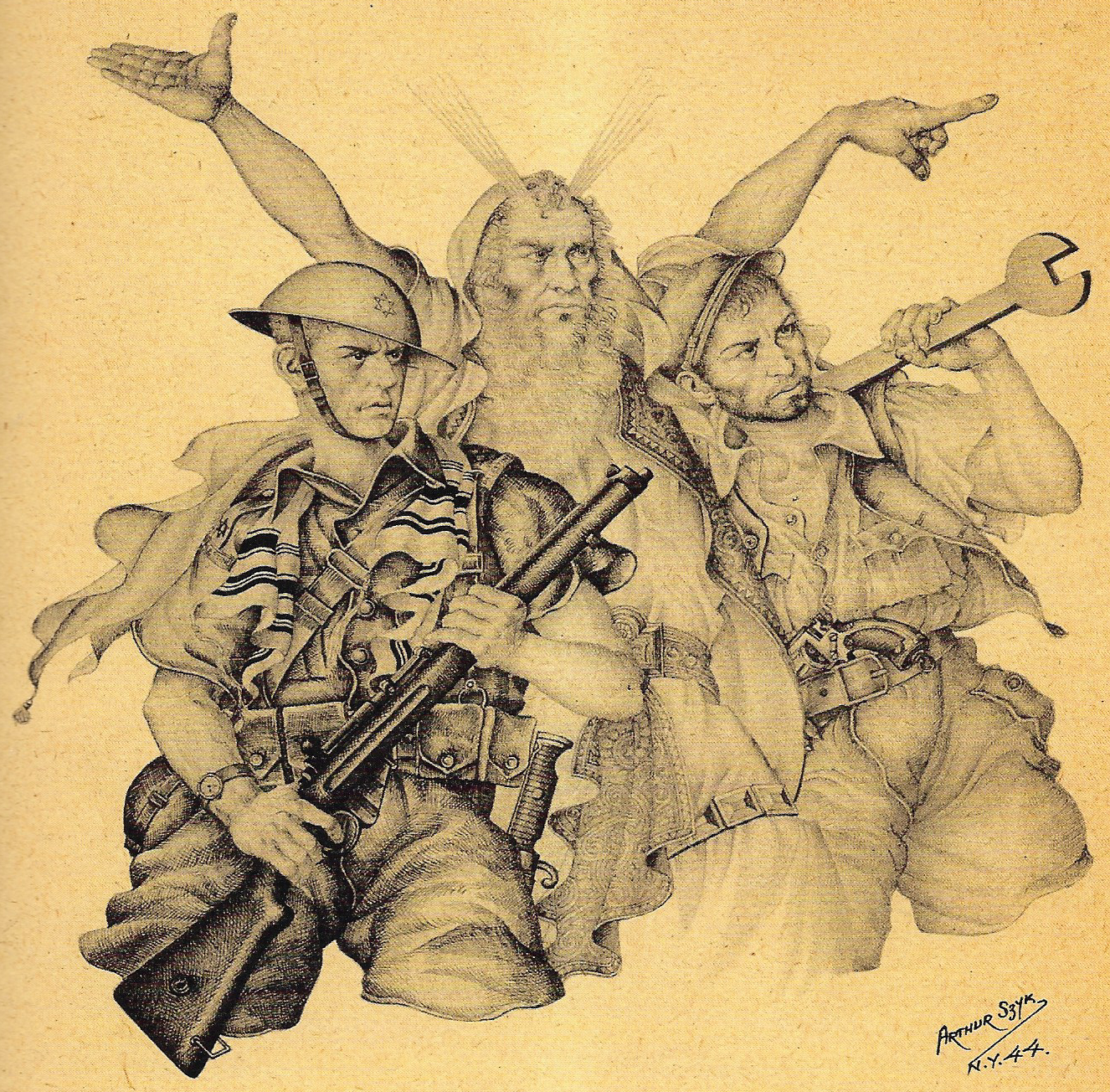 «Новый Моисей» (1944). Что бы там ни было с «Белой книгой», фашизму противостоять надо. И если для поселенцев в Палестине это можно делать только под британским флагом — значит, да будет так. Впрочем, револьвер за поясом рабочего все-таки остается: «змей» никуда не делся.