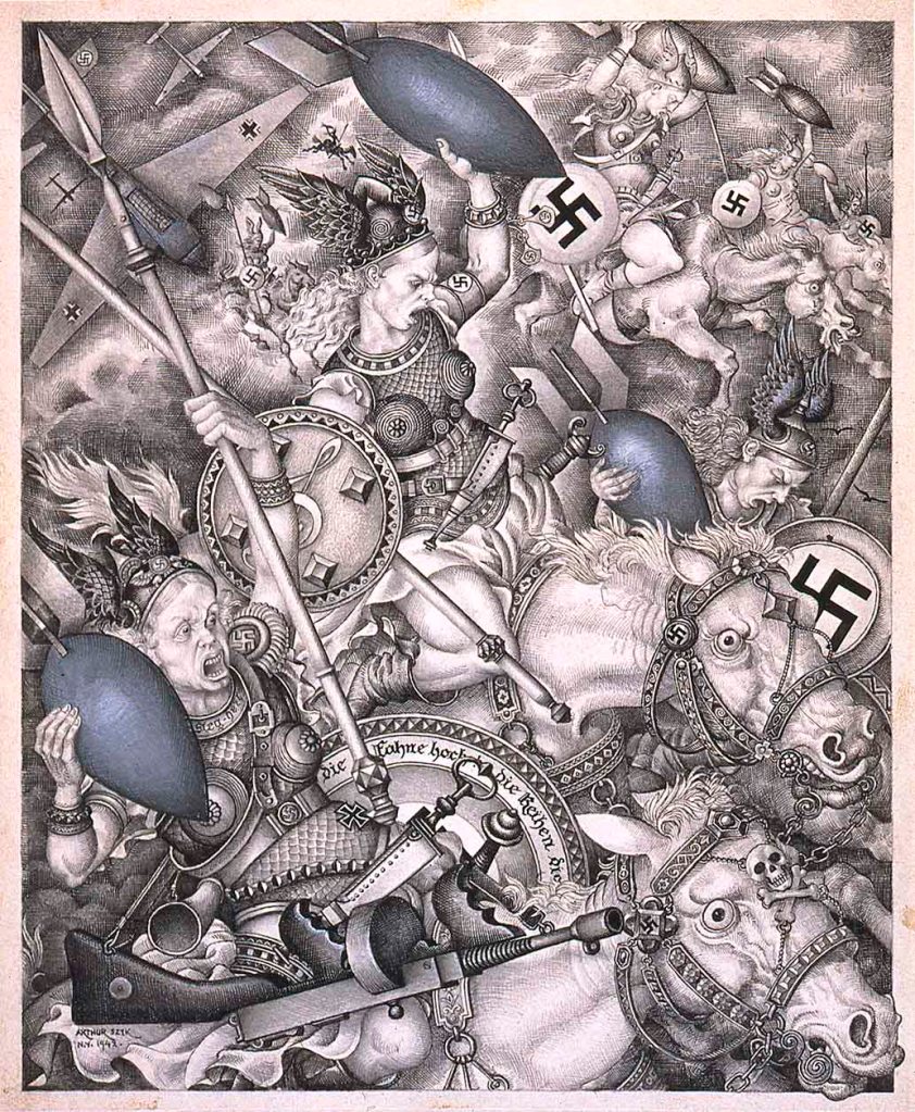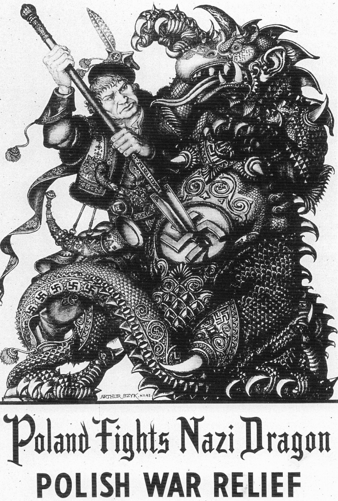 «Польша борется с нацистским драконом» (1941). Этот дракон, олицетворяющий не только нынешний фашизм, но также его исторических предшественников и потомков, в творчестве Шика появляется регулярно: мы еще вернемся к его образу и в этом номере, и в следующих.