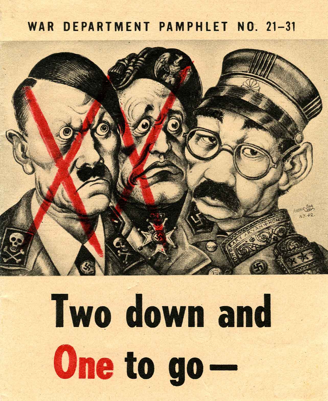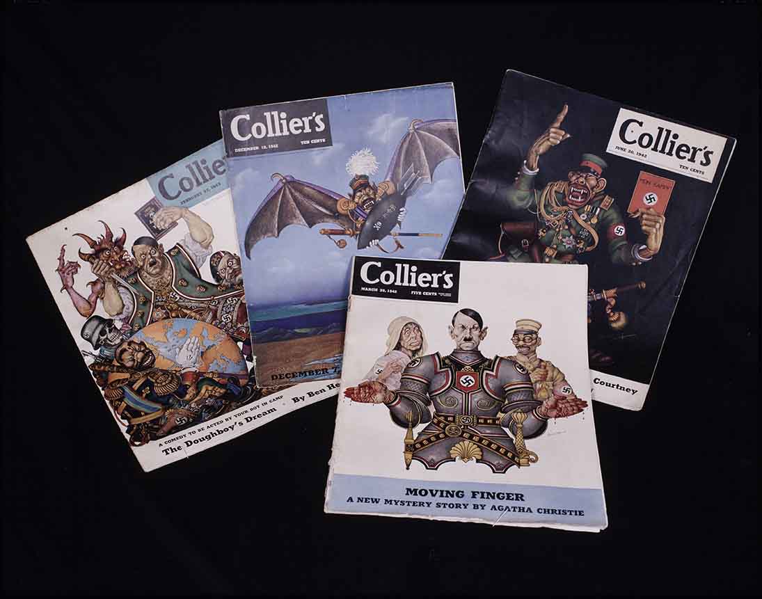 1943 год: «Хирохито, Гитлерито и Бенито» (как в одной из своих ранних карикатур назвал Шик эту «неразлучную троицу») в разных сочетаниях на обложках еженедельного журнала «Кольерс». Япония — основной враг, но художник не забывает подчеркивать (да, американской аудитории все еще нужно было постоянно это напоминать), что с гитлеровской Германией она «одним миром мазана». Также надо было постоянно напоминать о перевернутой, превратившейся в свою противоположность сущности «рыцарской легенды», которую в пропагандистских целях регулярно примерял на себя Третий рейх…
