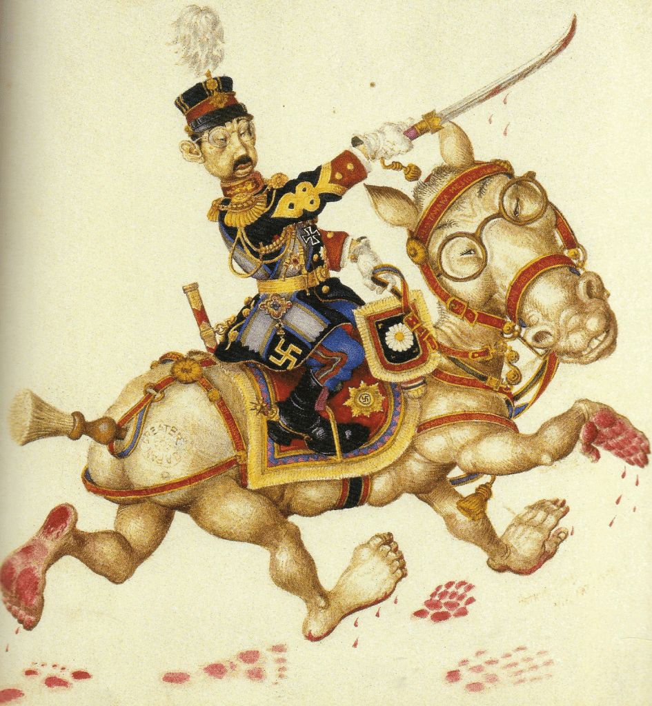 «Сын неба» (1945): все тот же Хирохито собственной персоной верхом на абсолютно фантастическом звере, так сказать, «обратном кентавре». Самурайский меч в его руках тоже «не той системы»: Шик, по-видимому, еще не имел возможности увидеть катану своими глазами — в отличие от шашки и кавказского кинжала, которые он изображает полностью грамотно.