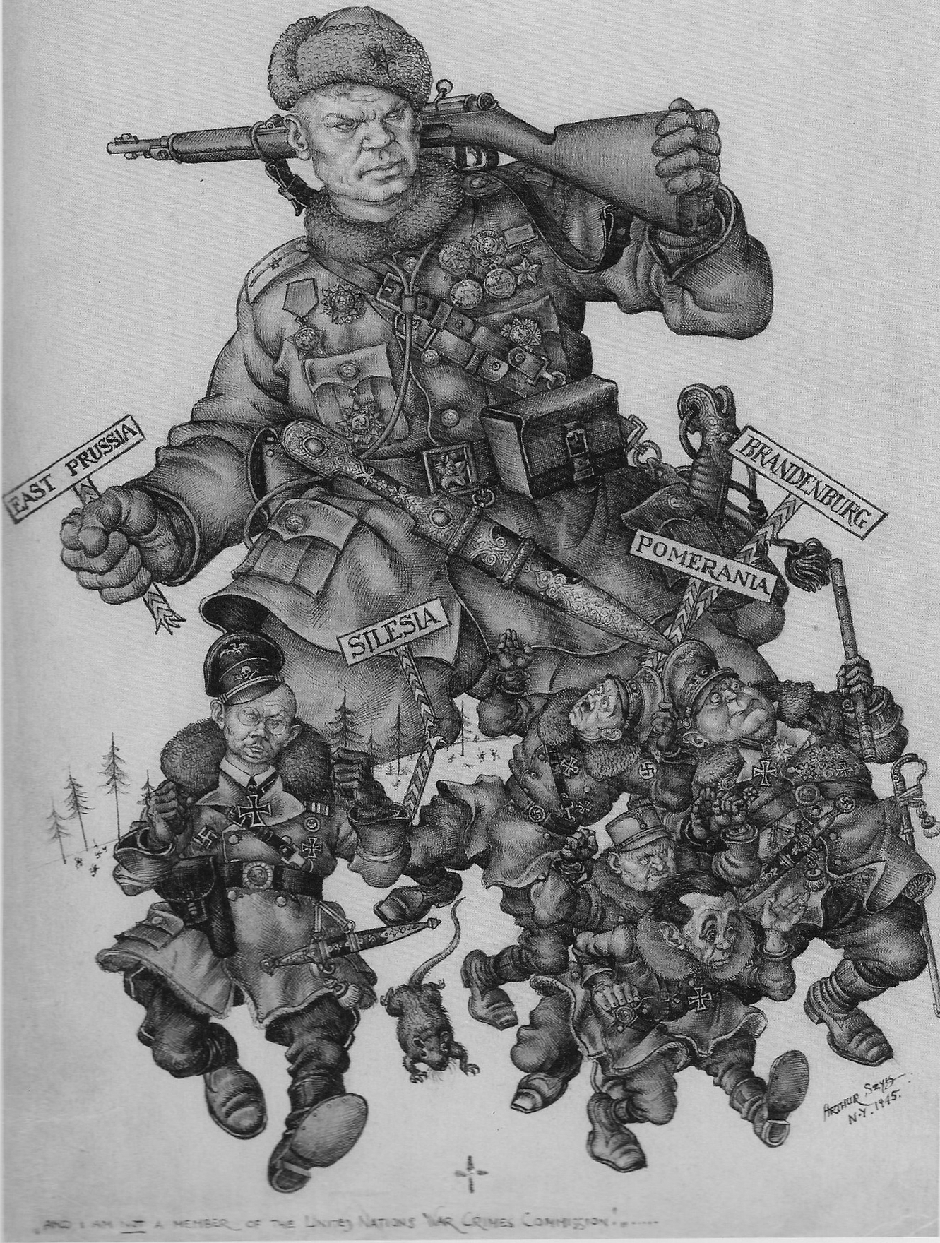 «А я вам не член Комиссии объединенных наций по военным преступлениям!» (1943) Вот и тот самый советский солдат, изображенный не менее портретно, чем его польский брат по оружию. Что это за комиссия и какие претензии к ней могли возникнуть у фронтовиков (и не только!) — см., например, по этой ссылке: https://ru.wikipedia.org/wiki/Комиссия_ООН_по_военным_преступлениям. Практический смысл — что немцам надо поскорее убираться с территорий «этнических анклавов» в Восточной Европе и на решения благоволящих к ней членов этой комиссии им уповать отнюдь не следует. В 1943 году это была еще не столько сбывшаяся реальность, сколько предупреждение — которое вскоре начало сбываться…