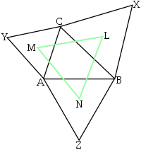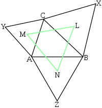 Если на каждой стороне произвольного треугольника построить по равностороннему треугольнику, то треугольник с вершинами в центрах равносторонних треугольников — также равносторонний*.