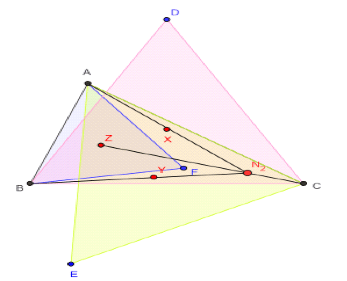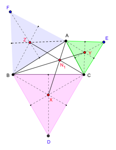Доказательство теоремы не входит в наши задачи, но запомним само построение: у нас есть внешний многоугольник AYCXBZ и внутренние треугольники ABC и MLN, причем MLN находится в центре многоугольника. Собственно, многоугольник легко аппроксимируется треугольником XYZ и для простоты можно его так и называть… для меня в данном случае важна не геометрическая точность, а возможное развитие мысли. Опираясь на только что сделанное построение, сделаем еще одно. Обозначим теперь получившийся внутренний равносторонний треугольник точками XYZ. Проведем из каждой его вершины (они соответственно являются центрами равносторонних треугольников, построенных на сторонах треугольника ABC) линию к противоположной вершине нашего исходного треугольника. Все эти линии пересекутся в одной точке. Она называется первой точкой Наполеона — N1**.