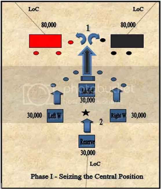 В качестве примера успешного сражения можно привести Аустерлиц, где Наполеон вначале завоевывает центральное положение, захватив Праценские высоты (прежде он сам отдал их русским в качестве приманки… нужно было, чтобы союзники атаковали французов и увели свои войска в долину), затем, сдерживая правый фланг неприятеля, уничтожает его левый фланг: он действует на внутренних коммуникациях, а русская и австрийская армии принуждены действовать на внешних, поэтому меньшая численность его армии совершенно не мешает ей везде оказываться сильнее врага. Третья фаза оказывается как бы излишней, поскольку неприятельская армия разбита наголову и бежит.
