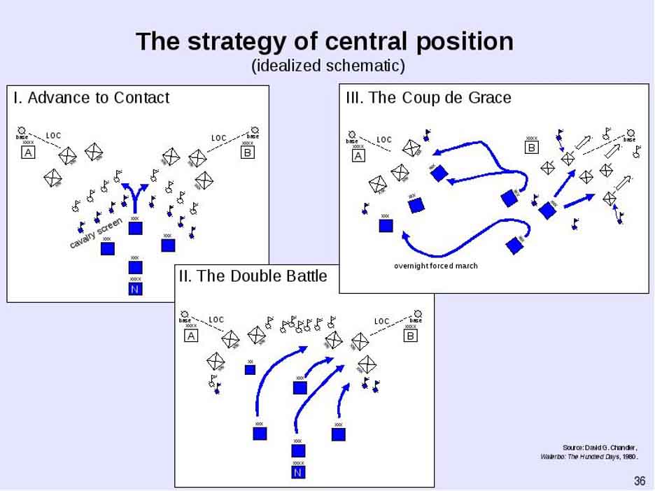 Еще один не менее яркий пример — кампания, которая окончилась несчастной битвой под Ватерлоо. Наполеон вполне удачно завоевывает центральное положение, разделив армии Веллингтона и Блюхера в результате маневра у Шарлеруа. Затем корпус маршала Нея вступает в сражение с Веллингтоном у Катр-Бра, а сам Наполеон обрушивается на Блюхера при Линьи — правда, не наносит ему сокрушительного поражения, а только отбрасывает. В третьей фазе он должен был уничтожить Веллингтона, но судьба решила иначе. Кстати, неудачная попытка Груши сковать Блюхера боем у Вавра — часть той же стратегии. По сути, это было двойным сражением, так же как и Линьи — Катр-Бра, и должно бы называться Ватерлоо — Вавр. На этих примерах видно, что использование любой стратегии может быть удачным и неудачным, поскольку успех зависит от множества факторов. Это не компрометирует саму стратегию: маневр при Шарлеруа был блистательным, но ошибки и несчастливое стечение обстоятельств могут погубить любой замысел.