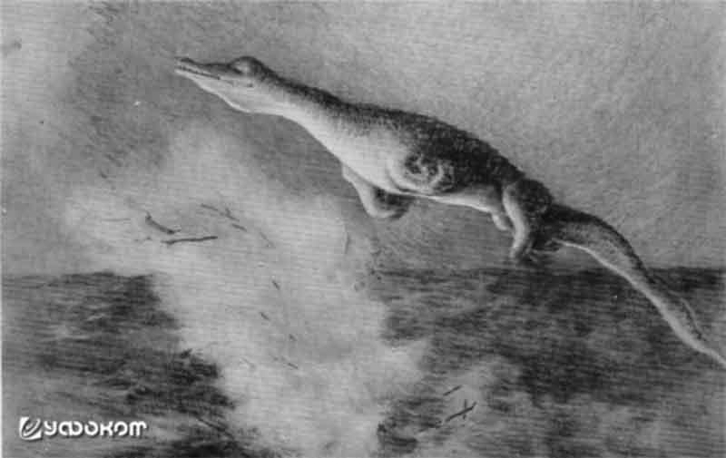 В этот момент со мной в рубке были вахтенные офицеры, главный механик, штурман и рулевой. Мы все одновременно принялись указывать друг другу на морское чудо. Так как ничего подобного не было описано ни Брокгаузом, ни Брэмом, увы, никак опознать его мы не могли. Нам не хватило времени, чтобы сфотографировать животное, так как оно исчезло в воде через 10—15 секунд… Оно было примерно 20 метров в длину и по форме напоминало крокодила, имело четыре конечности с мощными ступнями, снабженными плавательными перепонками, и длинный, заостренный на конце хвост.